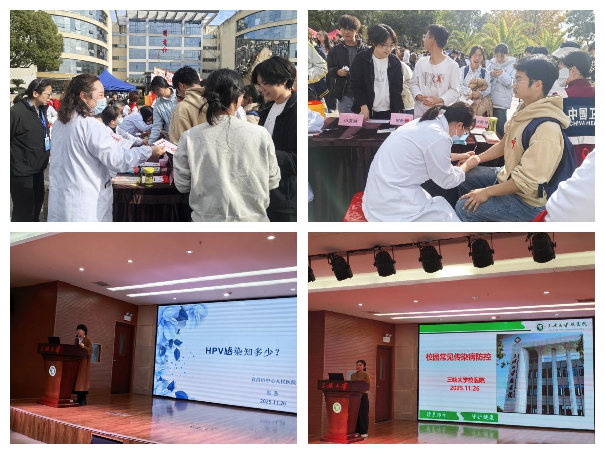 此前,由大学路社区与校医院联合承办的高校防艾主题宣传暨高校防艾宣传旗帜接力传递活动,在图书馆门前广场顺利举行。校医院为活动提供了坚实的专业支持和健康保障。由中医科、皮肤科、口腔科、预防保健科骨干力量组成的义诊团队,结合各自专业特长,为前来咨询的师生提供了多样化健康宣教和解答,并在现场发放宣传折页。在分会场图书馆昭君报告厅,校医院特邀宜昌市中心人民医院妇产科主任医师惠燕为同学们带来了一场题为《HPV感染知多少》的健康知识讲座,同时校医院也开展了主题为《校园常见传染病防控》的知识讲座。