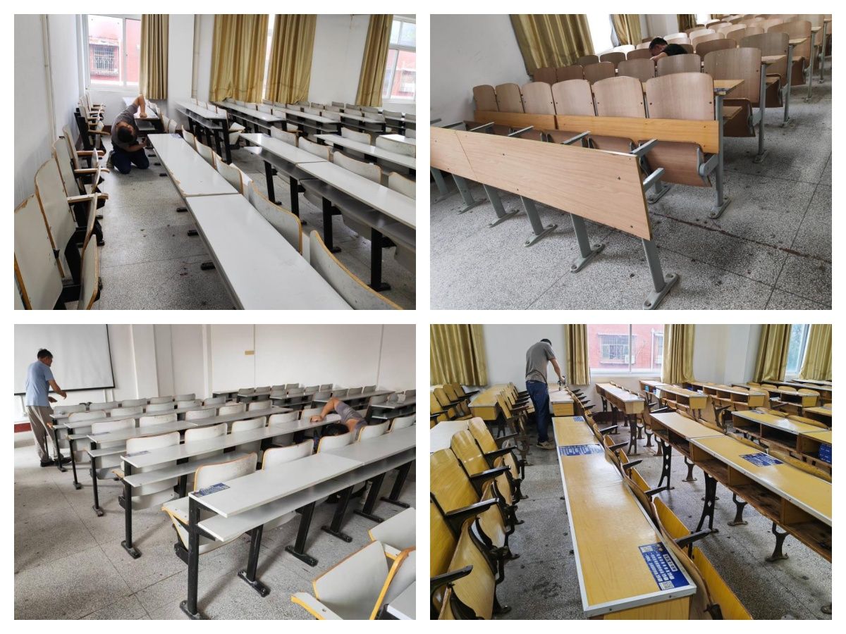 在举国欢庆的国庆中秋假期期间,南片校区后勤员工坚守一线,主动担当,利用教学空窗期对教室破损课桌椅开展了集中维修更换工作,以实际行动保障教学环境,诠释了服务育人的深刻内涵。
