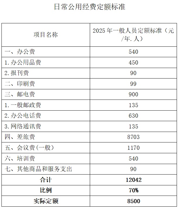 (2)日常公用经费(填报附件4):其中,日常办公的经费应结合本单位人员情况,参照2025年省直部门预算定额标准的一定比例编制,相关标准如下: