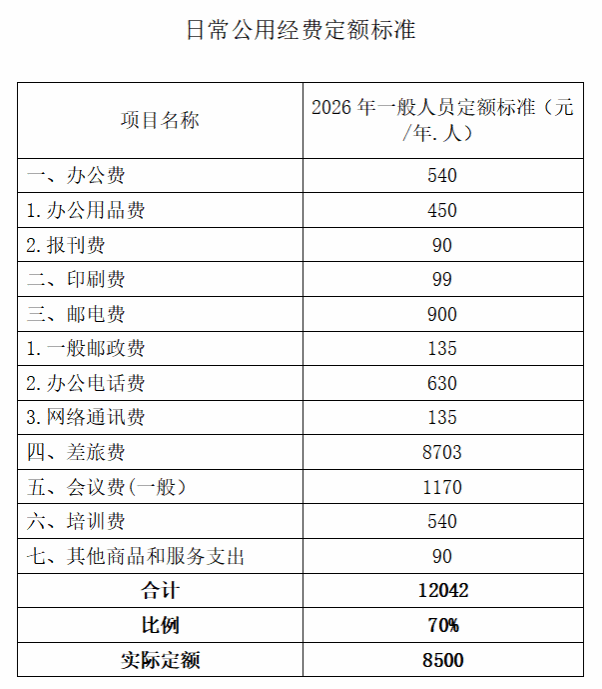 (2)日常公用经费(填报附件4):其中,日常办公的经费应结合本单位人员情况,参照2026年省直部门预算定额标准的一定比例编制(定额标准如下)。支出明细测算按“单价×数量”方式细化预算明细内容,单价要符合相关支出定额标准(详见附件6);数量要符合常理和切合实际。